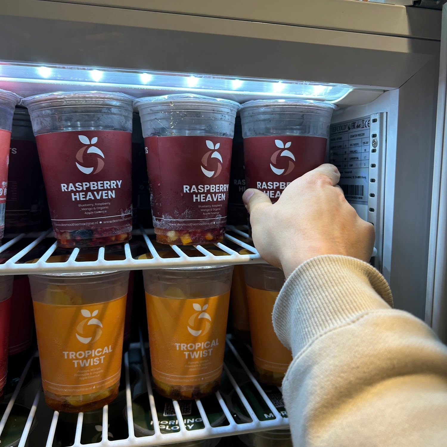 De Smoothiemachine is een volledig geautomatiseerde, personeelsvrije smoothie automaat 🥤 die verse smoothies, proteïneshakes, ijskoffies en meer serveert. Dankzij ingevroren porties van echt fruit, groenten en eiwitten is er geen derving en zijn alle drankjes altijd vers 🍓🧊.