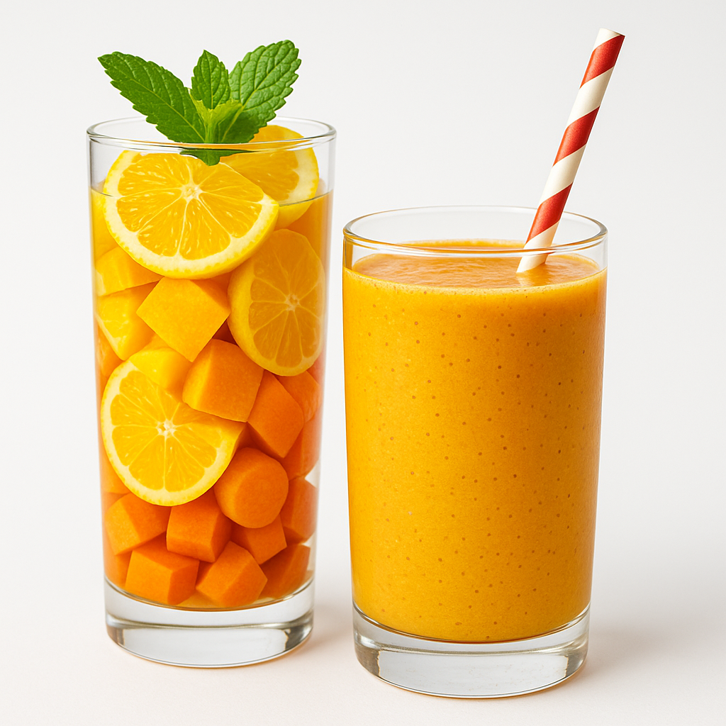 Deze smoothie combineert frisse citroen 🍋 en sappige mandarijn 🍊 met de zachte zoetheid van wortel 🥕 en zoete aardappel 🍠. Een vleugje kurkuma ✨ geeft een kruidige twist en extra kracht. Het resultaat is een kleurrijke smoothie die tegelijk verfrissend en voedzaam is. Altijd perfect geblend in onze slimme Smoothie Machine, 100% natuurlijk en zonder kunstmatige toevoegingen.